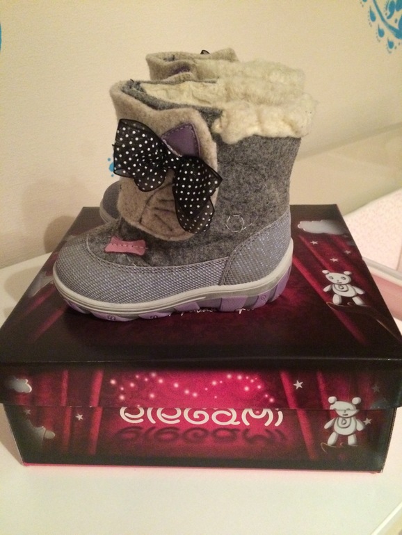 34) Валенки Elegami фабрика Парижская коммуна. Замечательные, очень теплые, внутри войлок, подошва не скользит, снег не забивается, не промокают, очень удобно надевать, штанишки можно как сверху, так и заправлять, если ножка не пухленькая. Размер 22, мы носили когда был 19, с носком отлично было. Без недостатков и следов носки. Цена 1600р