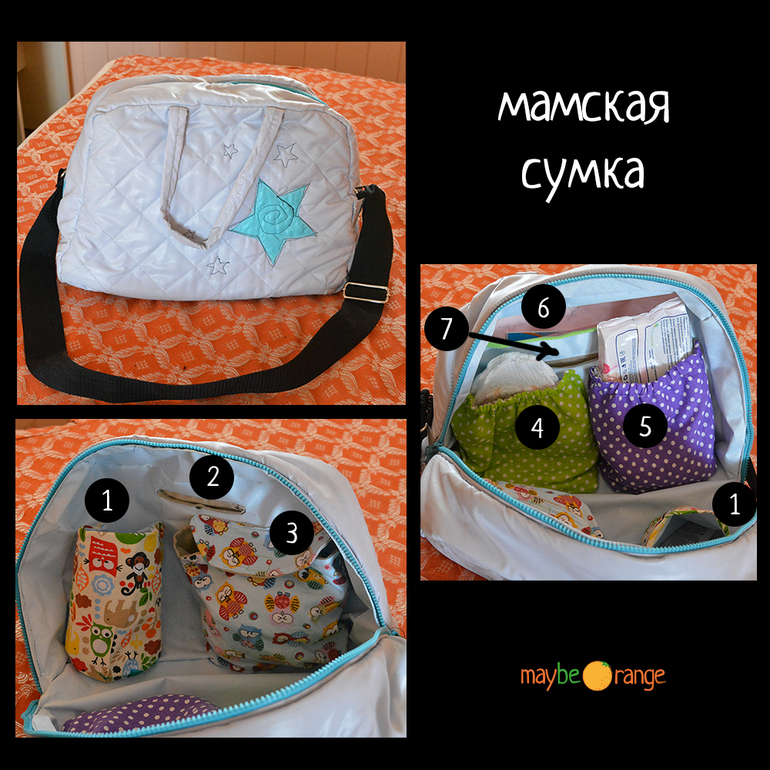 4. и 5. два кармашка на резинке. У меня там подгузники, непромокаемая пеленка, влажные салфетки