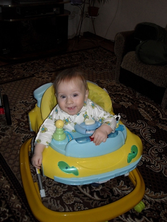 Что у нас нового: сидим мы хорошо, правда не ползаем, ленимся, в ходунках ганяем всё уверенее и уверенее. Так смешно наблюдать, когда малыш пытается то к кроватке подбежать, то к трюмо, дёргает ручками всё, за что цепляет, ну и конечно же в рот. То у мамы на ручках, а тут сам пытается подойти к чему захочет, "свобода"! Такое счастье наблюдать, как твоя радость