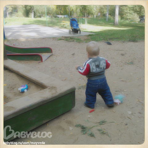 Идём на детскую площадку. Мирик возится в песочнице - я отдыхаю, дышу воздухом. Красота! Кстати, детей практически нет, все спят. А у нас дятлы дома долбят.