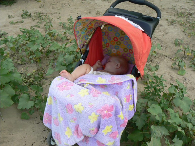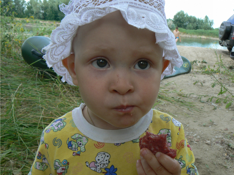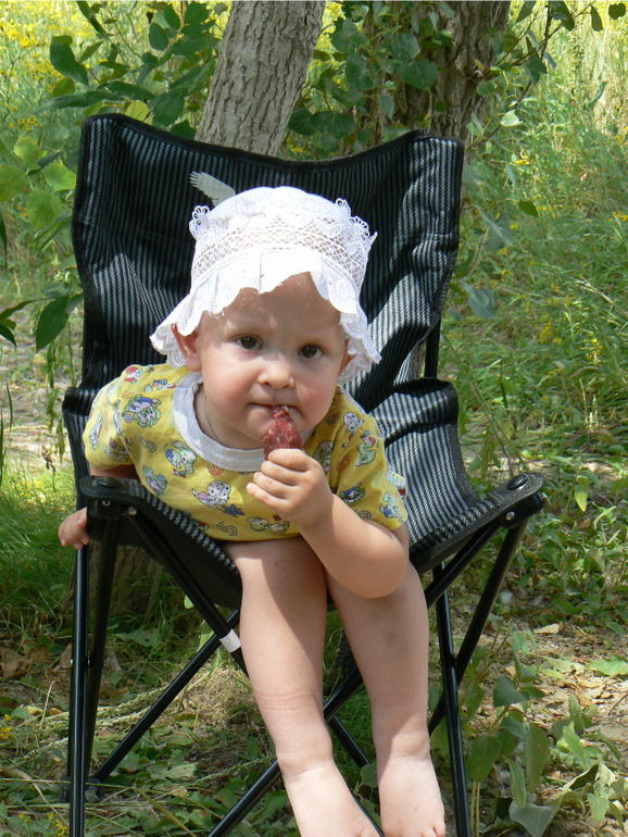 Уж она его и ела, и дула, и сыпала на себя, и сыпала на других.... Потом мама ее вымыла в реке под оглушительный крик протеста, быстро под полотенцико, сисю и спать))))