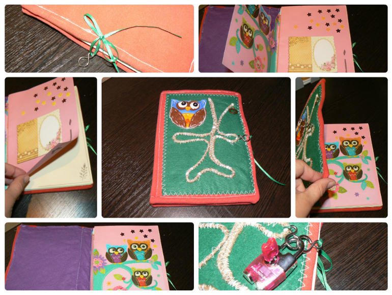 ты знаешь, я пока еще не мастер))))) есть на разных ресурсах разные мастерклассы — я смотрю, беру идеи и вперед)))))ткани- самые обычные. На обложку только (поняла) не тянущиеся — типа хлопка, сатина.... а то едет обложка. внутрь толстый картон.... Вот в дневнике использовала страничку от детской книжки — там двойной проклееный картон — очень жестко -хорошо. а книжка из серии "какую-то хню детям написали" — про трусливого мдведя... вот я с удовольствием и пустилее на поделку))клей пва, клей кристал, мнитки, фетр, кучу деталек скрапбукинговых. я покупала в леонардо вот эти все висючки, часики..... скупала для альбома Машкиного, но пока к нему только приступила, а вот....совушку срисовала с открытки — пошила из фетра....
