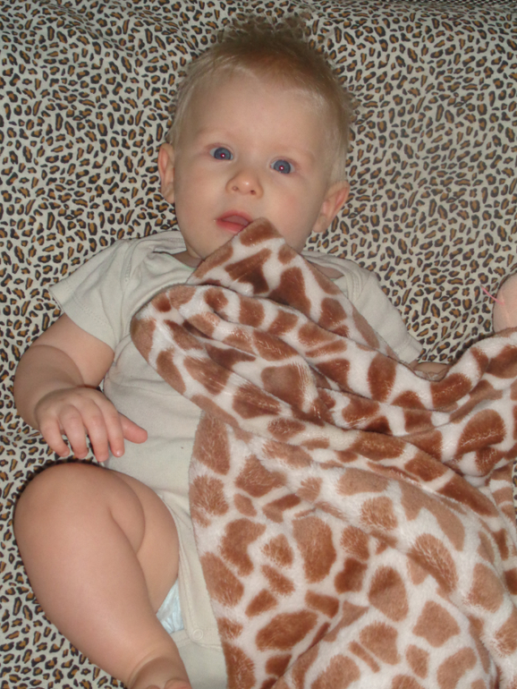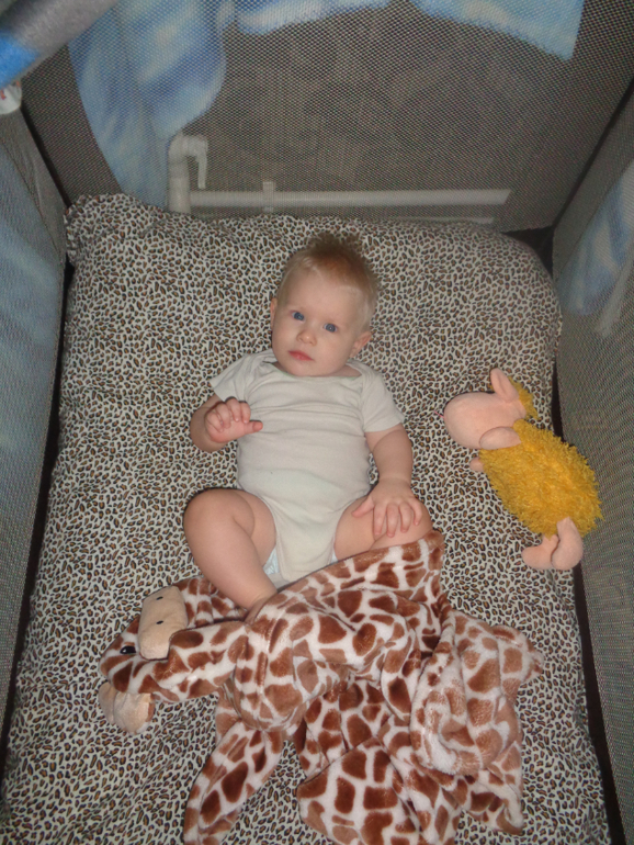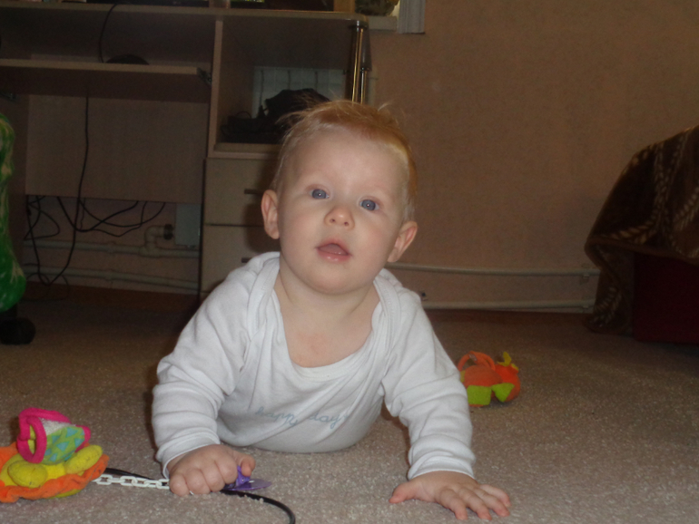Хохотун и улыбашка. Всеобщий любимчик. Раскачивается на четвереньках, даже чуть- чуть ползает,а вот сидеть ни в какую не хочет. Даже когда подтягиваю за ручки он сразу встает на ножки. походу сразу хочет бегать. Днем спит два раза,ночью тоже более-менее стали высыпаться,потому что наконец-то прорезался второй нижний зубик. Кушает овощи,фрукты,молочку,кисломолочку,кашки... Наладился стул,животик уже давно нас не беспокоил.. Малыш доволен и счастлив,ну и мы все,конечно,тоже.