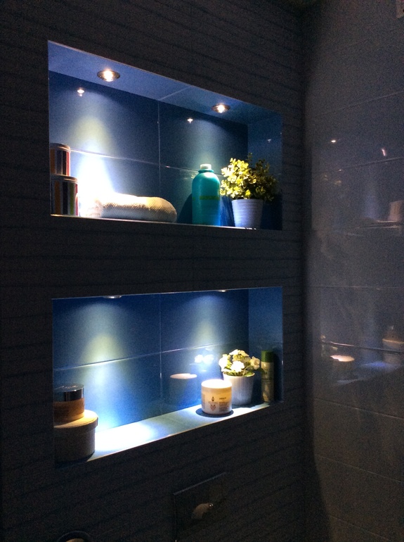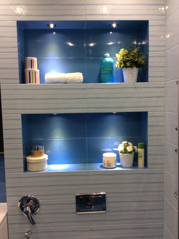 Маленькие лампочки в нишах - очень удобно. Особенно во время ночных походов в туалет. К тому же получается очень красивый интимный свет. Жаль фото не передаёт этого освещения