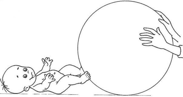 1. Малыш лежит на спине. В ноги положите мяч. Приближая мяч к ногам ребёнка, побуждайте его отталкивать мяч ногами.