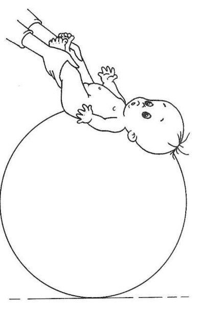 5. Положите ребёнка животом на мяч. Поддерживая его одной рукой за ноги, а другой - за правую руку, поворачивайте малыша влево, укладывая на левый ?6?