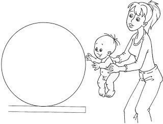 6. Положите мяч на стол. Держите ребёнка перед собой в вертикальном положении лицом к мячу. Поднесите малыша к мячу и наклоните его так, чтобы он опёрся на мяч. Пусть малыш не просто опирается на мяч, но ещё и толкает его вперёд.