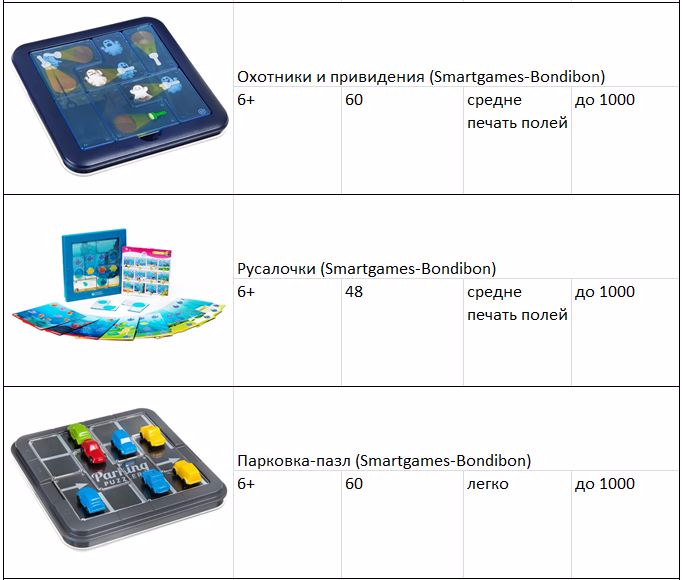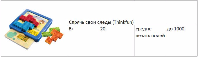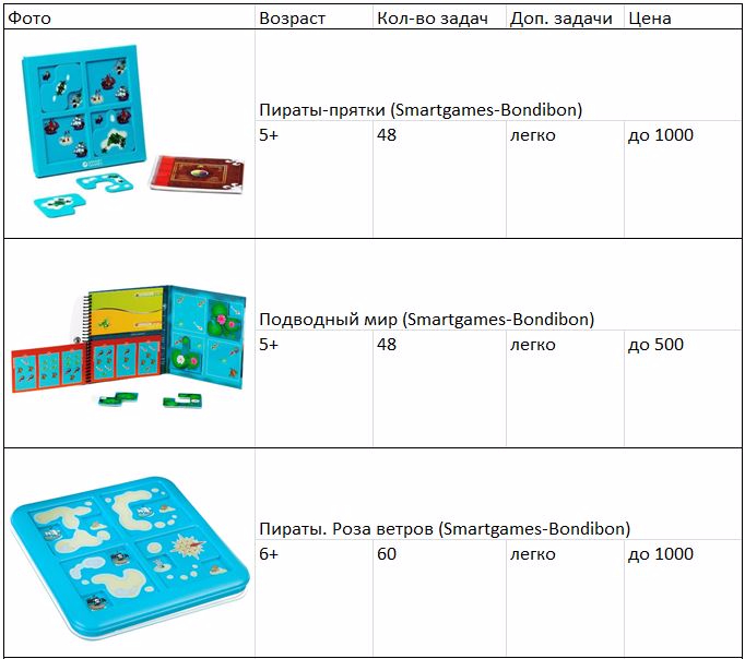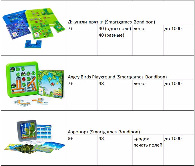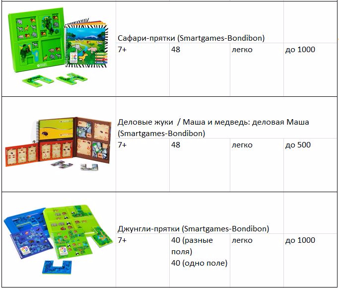 Целых шесть головоломок с одной и той же механикой. При этом (по форме деталей и расположению изображений) Пираты-прятки и Подводный мир, а также Сафари-прятки и Деловые жуки являются копиями друг друга. Отличаются эти головоломки компактностью: Подводный мир и Деловые жуки - игры для путешествий, с магнитной основой. Судя по всему, Пираты-прятки и Сафари-прятки уйдут из ассортимента. На смену первым выпустили головоломку Пираты. Роза ветров - эта версия чуть легче на простых уровнях благодаря наличию подсказки с розой ветров. На смену Сафари-прятки пришли Джунгли-прятки с двусторонним полем, одно из которых представляет собой привычные отдельные участки, а второе - целое поле, на котором нужно разместить все четыре детали головомки.
