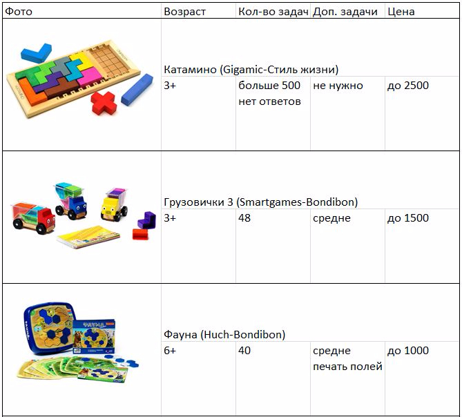 Перед нами поле и фигурки разной формы, которые нужно в это поле уложить. Изюминка головоломки в том, что величину поля вы можете регулировать сами, постепенно наращивая сложность игры. Минус головоломки в том, что в брошюре нет ответов к задачам. Обратите внимание на то, что существуют разные версии Катамино. Базовая версия с разноцветными деталями подходит для самых маленьких детей благодаря тому, что (1) содержит в наборе кубики-единички, (2) позволяет создать маленькое поле (3 столбика) для выкладывания фигур, (3) есть образцы для создания фигур животных, (4) сами фигурки крупные, выполнены из дерева. Другие версии Катамино предназначены для детей постарше из-за отсутствия некоторых из указанных характеристик.