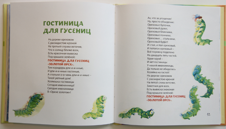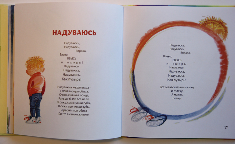 Один из любимых стихотворений в этой книге:"Во дворе (Заблудился!)" Дверь. Крыльцо.Цветы. Дорожка.Куст. Сарай.(В сарае — кошка!)Клумба. Дерево. Забор.Это всё зовётся Двор!Куст. Сарай.(В сарае — кошка!)Снова куст...А где дорожка?!Будка!(В будке — страшный лай!!!)Клумба...Дерево...Сарай...Снова куст!А где забор?!Заблужденье, а не двор!Вот тропа - Свернём направо:Лопухи!Репьи!Канава!..Как добраться до крыльца?Может быть, Начать с конца?Вот забор, а в нём — дыра.Рядом дерево - Ура!Слева — клумба,Справа — кошка.Куст.Знакомая дорожка.(Пахнет розами кругом!)Вот цветы,Крыльцои ДОМ!!! :)))