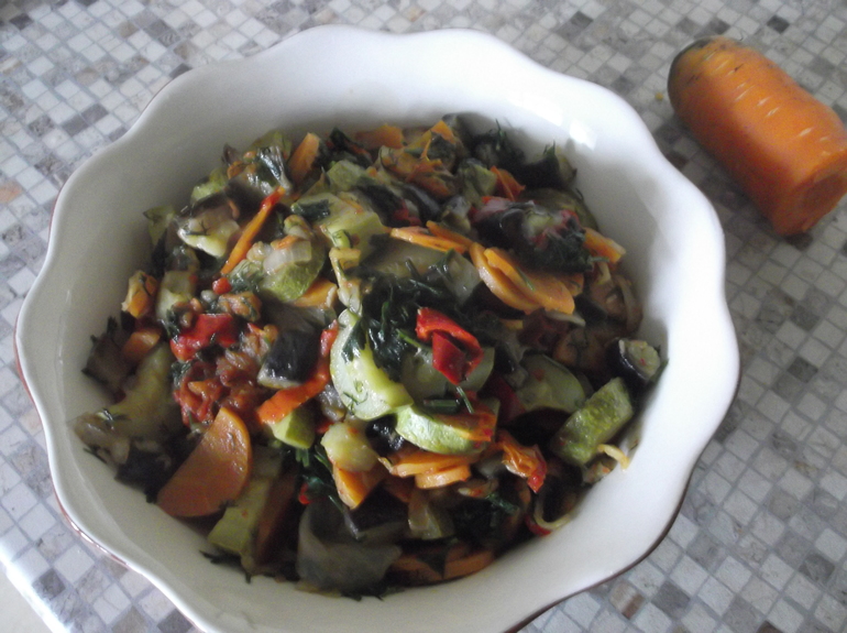 Я готовила на максимальном огне при закрытой крышке. Овощи дали естественный сок, в нем и тушились, когда сок выпаривается, я закидываю зелень, до готовности остается совсем чуть-чуть. Но некоторые овощи очень сочные и необходимо 10 минут под крышкой их тушить, а затем открыть все это дело. А какие-то овощи более сухие. Но я воду не добавляю, но знаю, есть те, кто любит с водой...