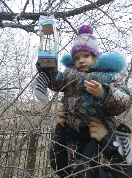 Так получилось, что первые пол-дня мы промотались по делам. И каждые две минуты на улице ребенок требовал кормить птиц! В итоге мы сдались, и пришлось срочно насыпать птичкам еду в случайно найденную по дороге кормушку: