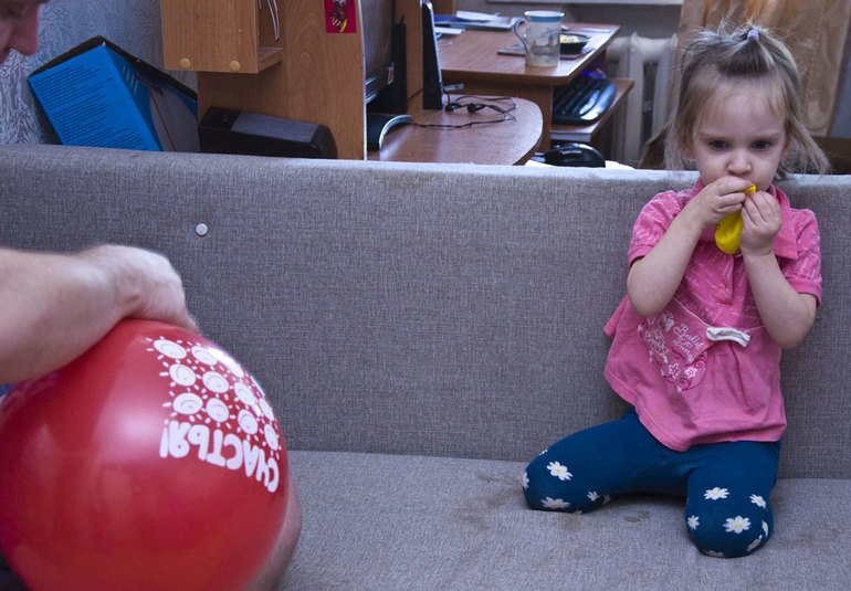 Конечно, пришлось надуть за ребенка, но сам процесс ей очень понравился. И она решила не протыкать шарик, а отпустить его с балкона, и с восторгом наблюдала за его полетом.