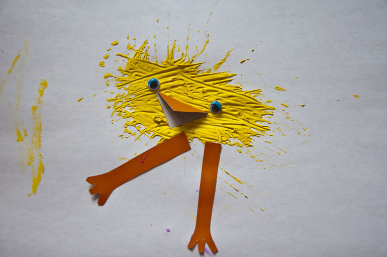 Цыпленыш (это Алиса его так назвала). Вилкой из лужицы краски. Я дала ей ножки, чтобы ровно приклеила, но Алиса была уверена, что Цыпленыш должен танцевать! Я не стала настаивать )