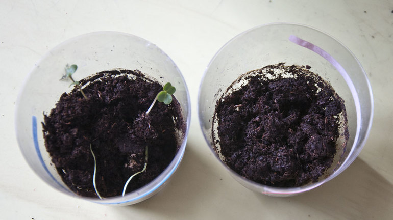 Неделю назад в два стаканчика с землей и водой положили одинаковые семена. Один поставили на окно, второй спрятали в темную коробку, и убрали в темный шкаф.