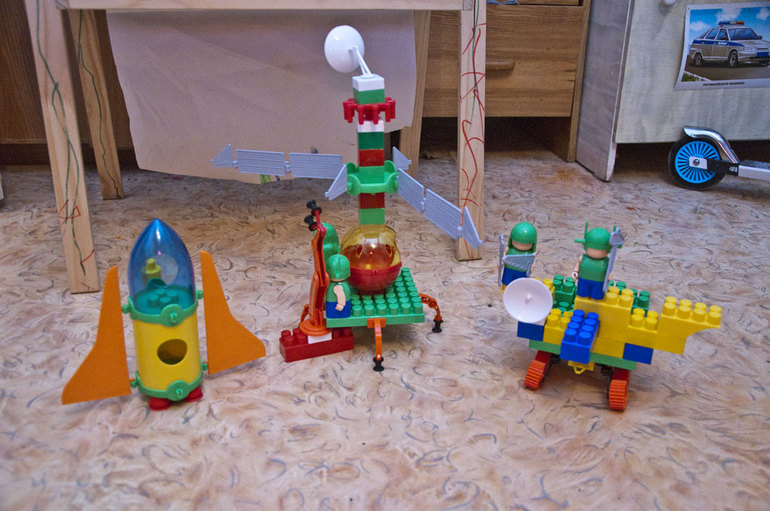 Набор оказался интересным. Есть и человечки-космонавты, можно сделать ракеты, луноходы, астероиды, и все, что фантазии угодно. Вот наши ракеты и станции:
