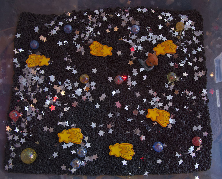 Крашеный рис, блестки-звездочки, марблс, кометы из подвески-мобиля. Фото играющейся Алисы нет, ибо я, видя заинтересованность ребенка, быстро сбежала в кухню по своим делам.