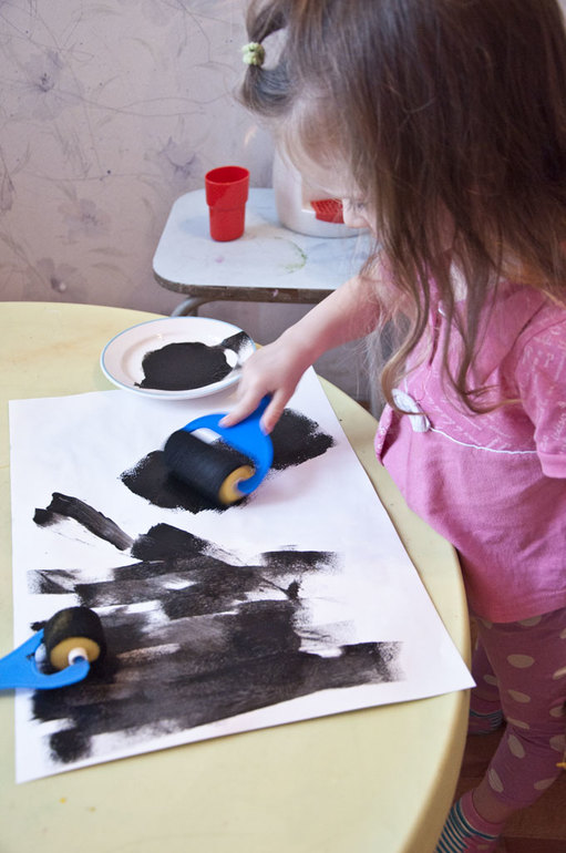 В плане творчества, Алиса нарисовала такую картину. Сначала валиком сделали вместе фон: