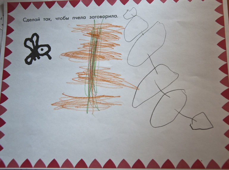 А недавно дала страничку из альбома на развитие фантазии. Задание читать не стала, сказала чтобы сама решала, что пририсовать к пчелке. В итоге вышла картина: