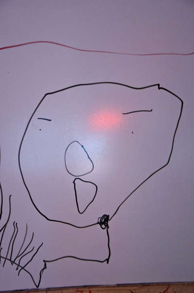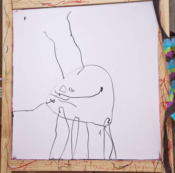 Примерно в то же время Алиса сказала, что на доске нарисован... удивленный собак (так и сказала) Она вообще любит рисовать эмоции на лицах. Слева в углу даже шерстку приделала.