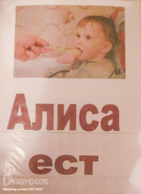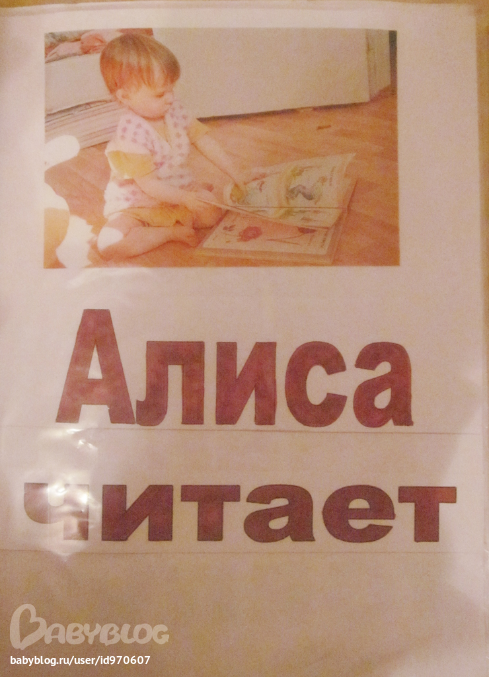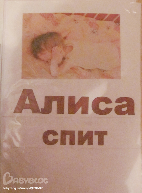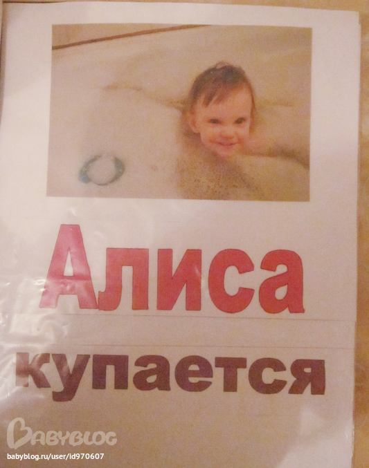 По методу Сессиль Лупан, описанному в книге "Поверь в свое дитя", сотворила первую Алискину книжку про нее. В книге на 10 листов, описан ее день, начиная со сна, заканчивая вечерним молоком. Красным шрифтом подписаны слова, для самостоятельного изучения. Алисе действительно очень нравится книжка про нее, и листает с удовольствием. Вот несколько страничек из книги: