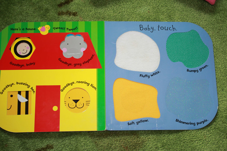 затем идут морды животных, с которыми можно поздороваться как на английском, так и на русском (пчела и слон немного пострадали, да), а также такие любимые мягкие овечка и уточка, пупырчаая лягушка и шершавая рыбка (синие мелкие блестки), на последнем развороте домик, в который, можно сказать, попрятались зверушки и выглядывают из окон и сами текстуры.