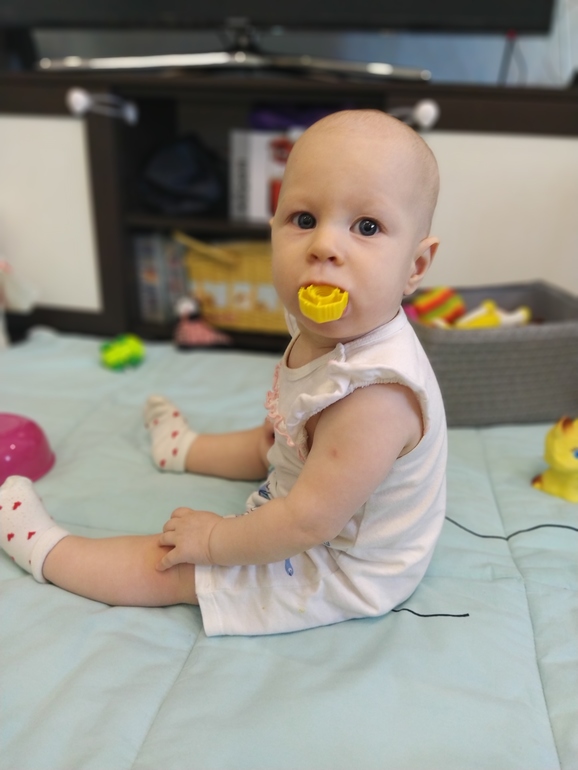 ✏️ Купаться пробовали в стульчике, не получилось, ноги плохо запихиваются, дочь и я истерим. Сидит просто на дне ванной, жуёт игрушки.