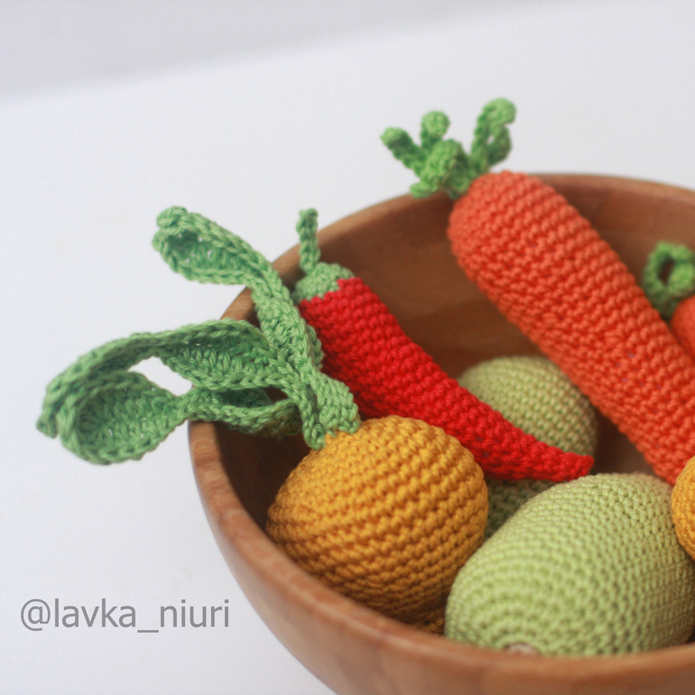 Малыши так любят все потрогать и пощупать, особенно если это что-то яркое)) Поэтому отличным дополнениям к детской кухне будут вязаные фрукты и овощи.