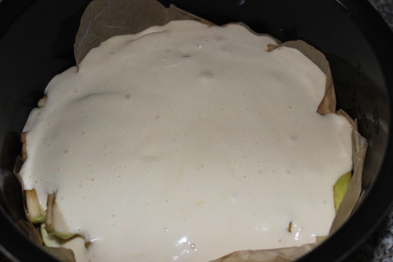 Укладываем слоями яблоки, у меня вышло 3 слоя и заливаем оставшимся тестом