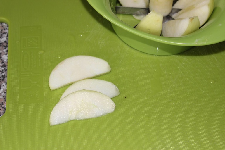 Яблоки не чистим, корочка и так не будет чувствоваться, нарезаем дольками