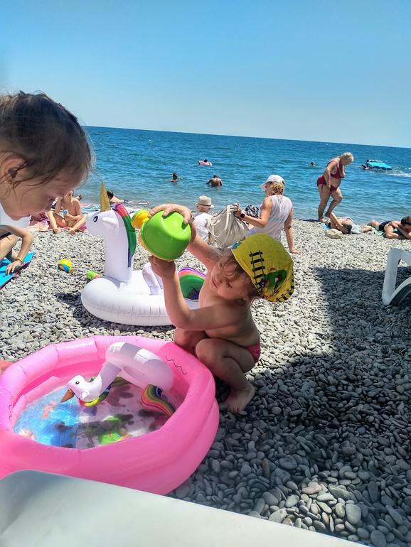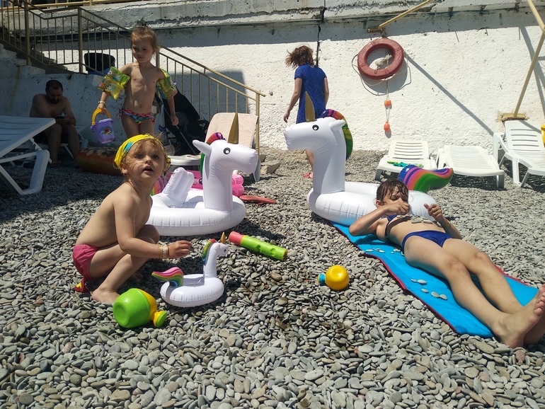 Пляж идти минут 7-8 мы не ходим по лестнице,когда с Машей по лестнице шли в магазин то 3-5 минут и море,обратно сложнее)