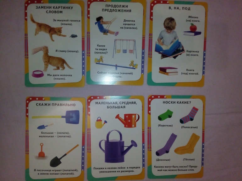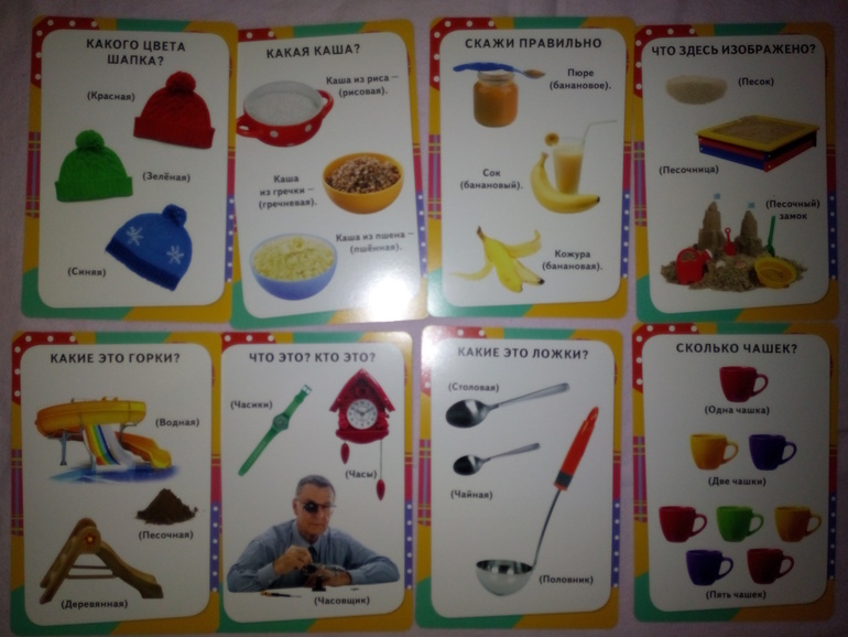 Карточки красочные, крупные (20х10см). Набор достаточно универсальный. Состоит из карточек на темы: "Игрушки", "Животные", "Еда", "Предметы в доме", "На улице". На обороте приводятся задания на совершенно разные темы: "один-много", "какого цвета" "большой-маленький" и т.д.