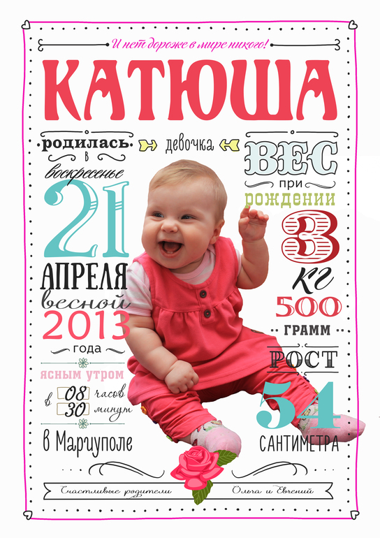 Обо мнеНедавно сделала сама себе небольшой подарочек: постер-метрику о Катюшке. И такой он чудесный получился, что просто не могу не похвастаться! А заодно порекомендую молодую, но очень перспективную . Кроме таких метрик, Студия может для Вас подготовить постеры, плакаты, цифры, колпачки, пригласительные, гирлянды и другую красоту, необходимую для оформления праздника. Всё быстро, качественно, стильно, а главное, индивидуальный подход гарантирован. Все макеты готовятся для каждого клиента новые с учетом всех пожеланий. Так что обращайтесь)