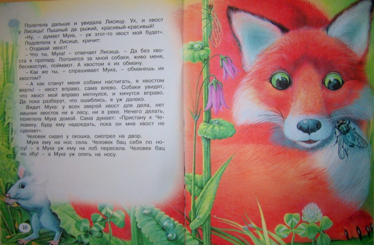 Сюжет рассказа - познавательный (как, впрочем, и всегда у Бианки) - муха очень хотела себе хвост, только не для дела, а для красоты. Вот и приставала она и к животным, и к рыбам, и к птицам в просьбой отдать свой хвостик. И каково же было ее удивление, когда оказалось, что всем-всем-всем хвосты даны природой не просто так. Рыбе хвост рулем служит, дятлу опорой, раку веслом, лисице помогает охотников обмануть... Летала муха, летала... не нашла себе хвоста. К последней - к корове пристала, а та ее хвостом и прихлопнула)