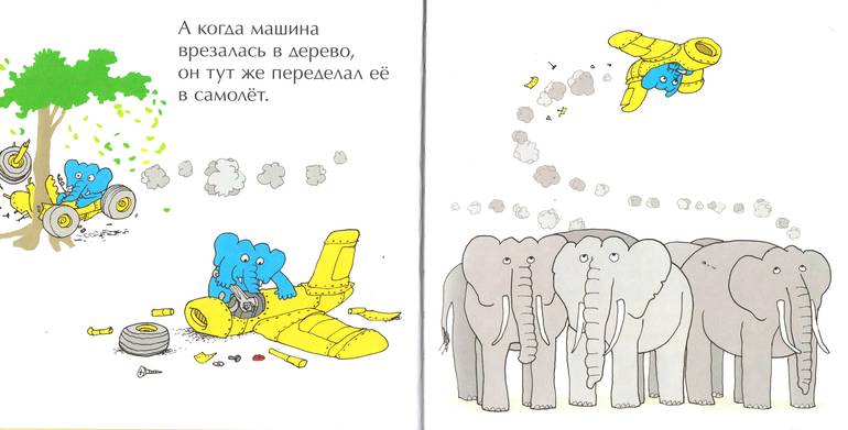 Сказка очень динамичная - слоненок совершает целое путешествие, встречает на своем пути множество героев. Он пытается стать аистом и решается лететь в настоящее птичье гнездо. Чтобы стать похожим на оленя привязывает себе на голову стул, а чтобы побыть павлином, сооружает себе красивый хвост из перьев.