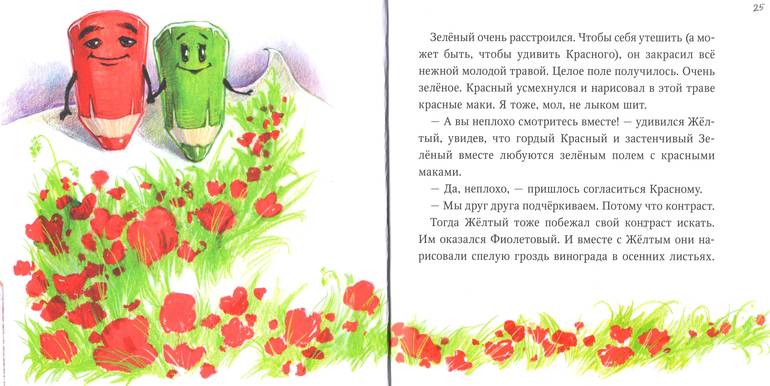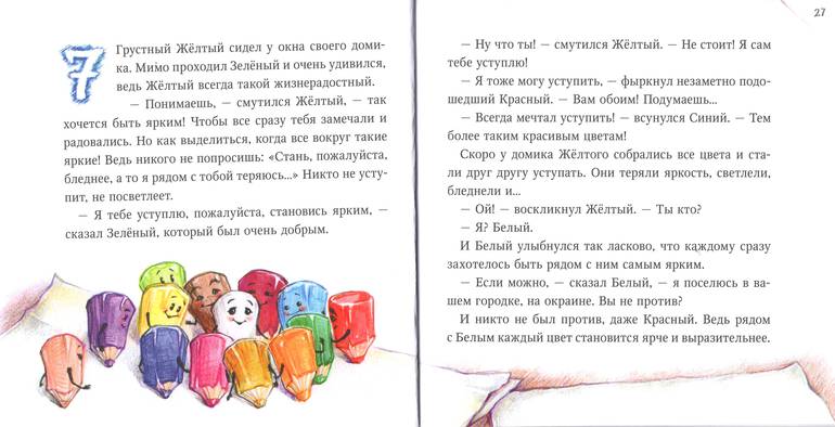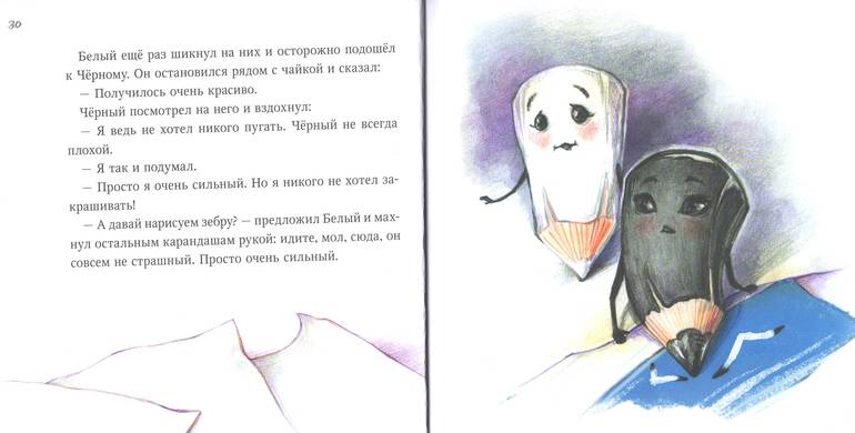 Иллюстрации Ольги Березинской просто чудесны! Они тоже карандашные, легкие и радостные, с мягкими штрихами, иногда очень детские и наивные, прекрасно дополняют сказку. Главные герои - карандаши - добрые и улыбчивые, одни застенчивые, другие решительные смельчаки, каждый со своим характером.