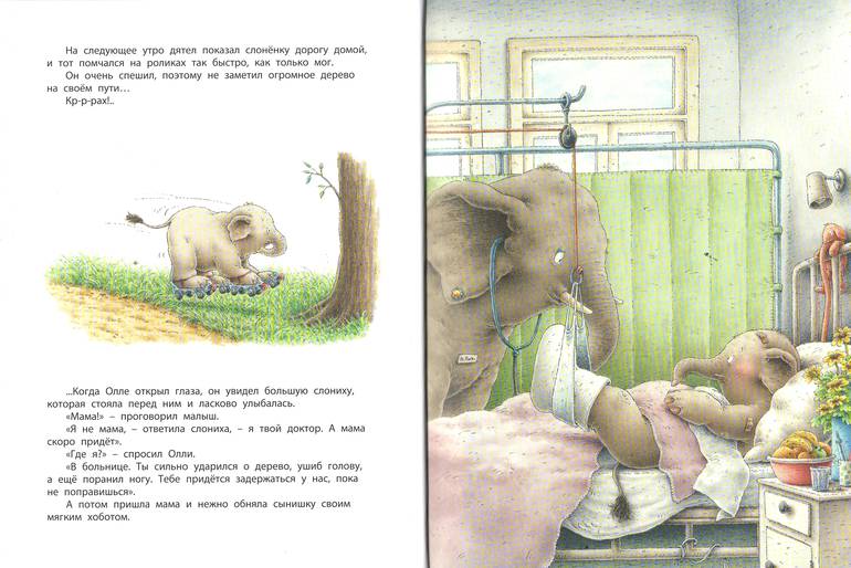 Иллюстрации чудесные! Маленький слоненок такой трогательный, такой маленький и беззащитный. Все детские переживания мастерски переданы художником Хансом де Беер. Рисунки в книге большие, детальные, но не яркие, выдержаны в спокойной сине-зеленой палитре.