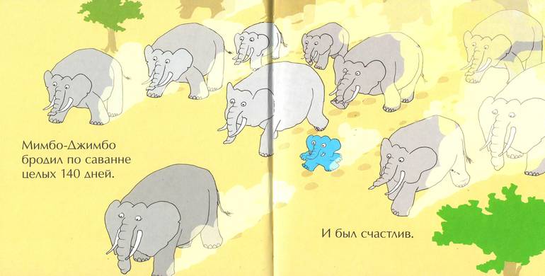 Краткое содержание (сюжет). Маленький синий слоненок Мимбо-Джимбо очень хотел найти своих дальних родственников, больших серых слонов, которые живут очень далеко, в саванне. Он боялся, что большие слоны не признают его, засмеют и прогонят, ведь они совсем не похожи, но всё-таки решился на дальнее путешествие. А большие серые слоны оказались мудрыми и добрыми, и приняли Мимбо-Джимбо в свое стадо. Слоненок жил с ними, занимался совсем не тем, чем обычно (бродил по саванне и купался в реке) и был совершенно счастлив. А потом вернулся домой к своим друзьям. Вот такая история, полная добра и позитива.
