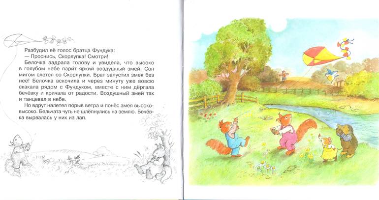 Это история о двух бельчатах, брате и сестричке Фундуке и Скорлупке, которые отправились к реке запускать воздушного змея, и их прогулка закончилась целым приключением! Воздушный змей запутался в ветвях старого дуба, отважные бельчата полезли на ветку, чтобы его снять, но сорвались в реку, и их унесло течением. Их друзья и соседи, лесные звери, весь оставшийся день искали попавших в беду малышей, и конечно же, всё закончилось хорошо!