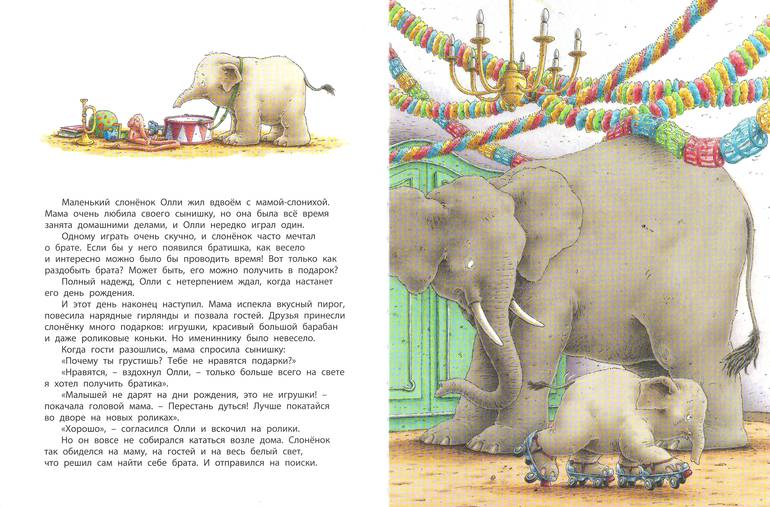 Маленький слоненок очень хотел получить на свой День Рождения настоящего живого братика. И конечно же его мечта не сбылась, ведь малыши - не игрушка, их не дарят на праздники. А слоненок очень разозлился, обиделся на свою маму и убежал из дома, чтобы найти себе другую новую семью. Каково же было его удивление и разочарование, когда он понял, что в каждой семье своя жизнь и свои правила, которые ему не подходят. И как же слоненок опечалился, когда понял, что новые братья и новая мама не заменят ему его любимой и самой родной настоящей мамы! Да еще к тому времени он уже ушел далеко, заблудился и не знал как ему вернуться... Конечно, история заканчивается благополучно! Малыш нашел дорогу домой и решил, что больше не будет никуда убегать, а мама пообещала, что со временем у него обязательно появятся и братишки, и сестренки.