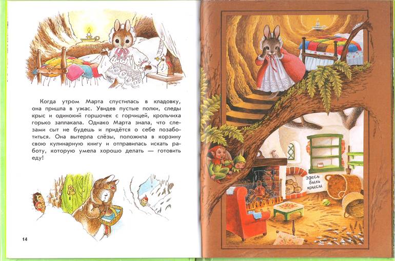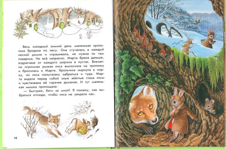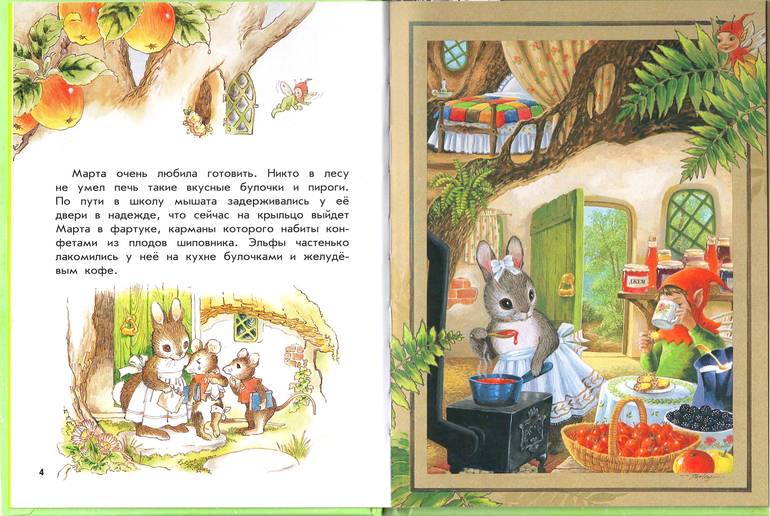 Книга замечательно проиллюстрирована автором. Все кролики, мышки, лисички тщательно прорисованы, до последнего волоска на хвостике. Прекрасны пейзажи - весенние цветы на полянках, осеннее золото листвы и снежные шапки зимой на ветвях и корягах, серебристая луна и розовая дымка рассветного солнышка. Феи в сверкающих платьях и с прозрачными крылышками, хмурый Гном с густой белой бородой, Марта в белоснежном накрахмаленном фартушке - всё очень атмосферно и сказочно. Такой стиль иллюстраций, с множеством подробностей, без схематичности и размазанности, мне очень нравится