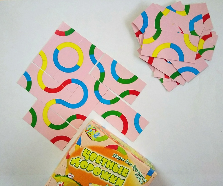 В комплекте 24 карточки, которые хранятся в небольшой коробочке. Карточки из тонкого картона, но ламинированные с двух сторон, поэтому порвать/намочить их довольно сложно. У издательства есть и другие игры подобного плана, где нужно совмещать рисунки на карточках. Я советую покупать сразу 2 набора, т.к. карточек не много и масштабности из них не получится) А во всем остальном игрой мы довольны и очень часто выстраиваем Цветные дорожки по вечерам.