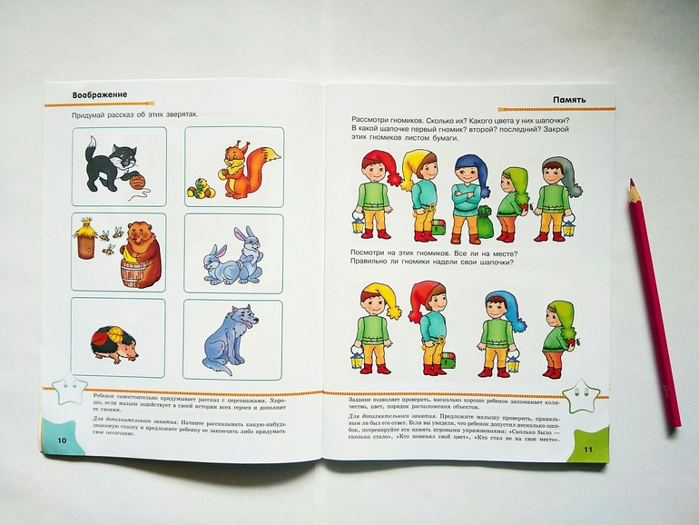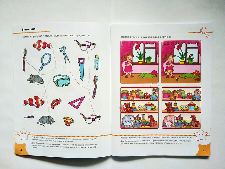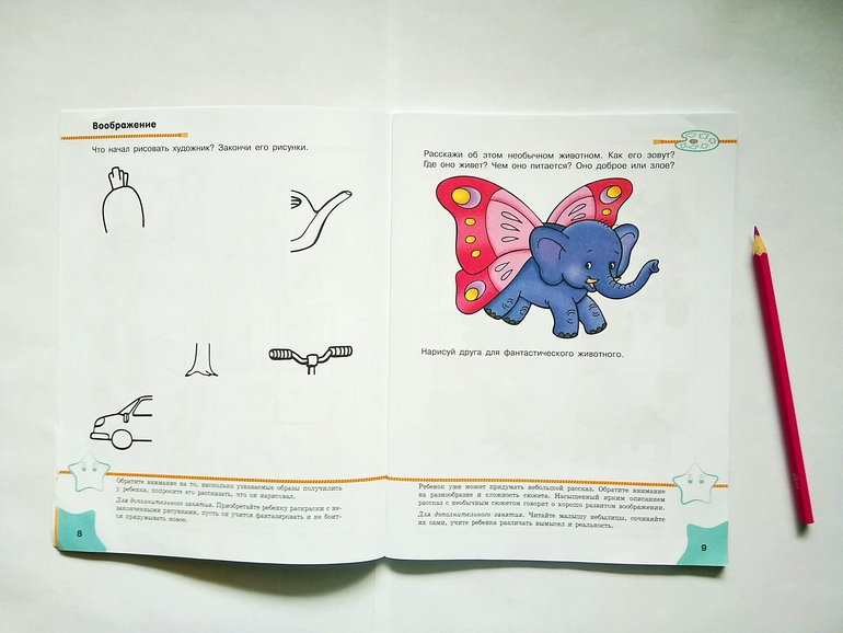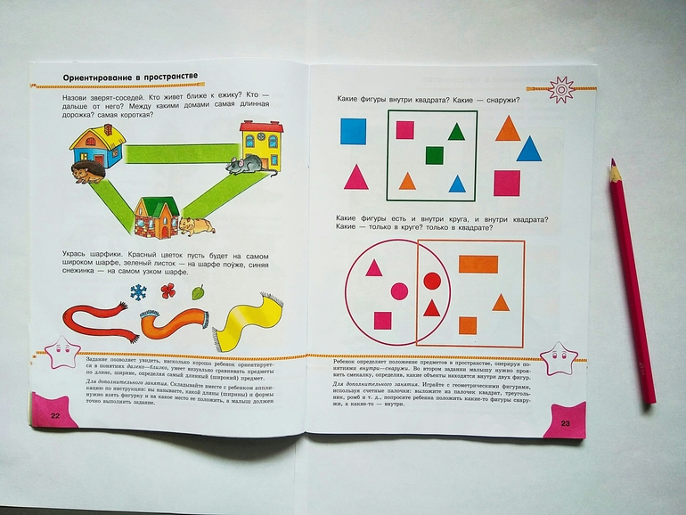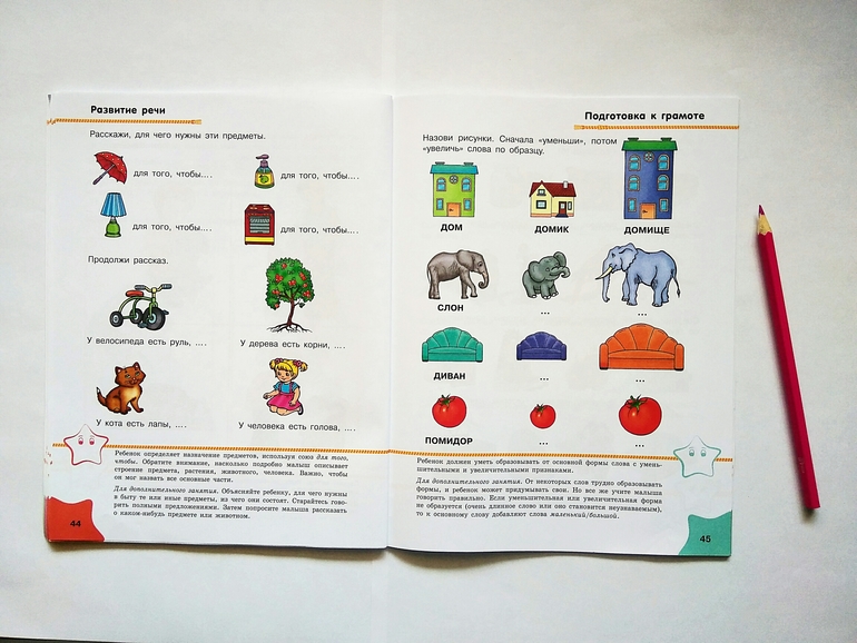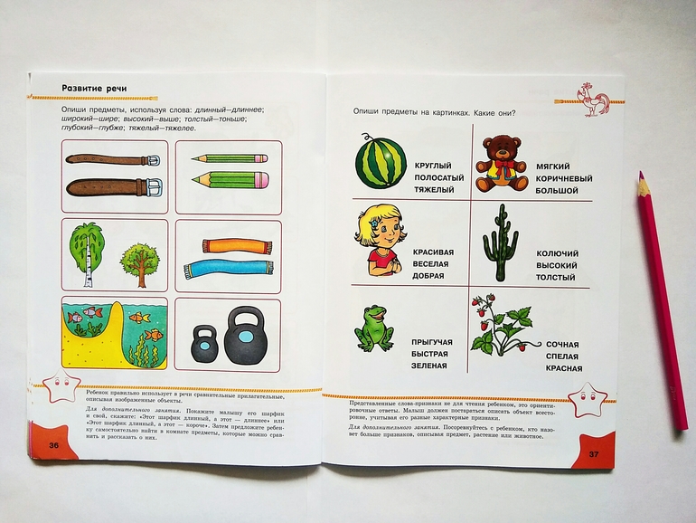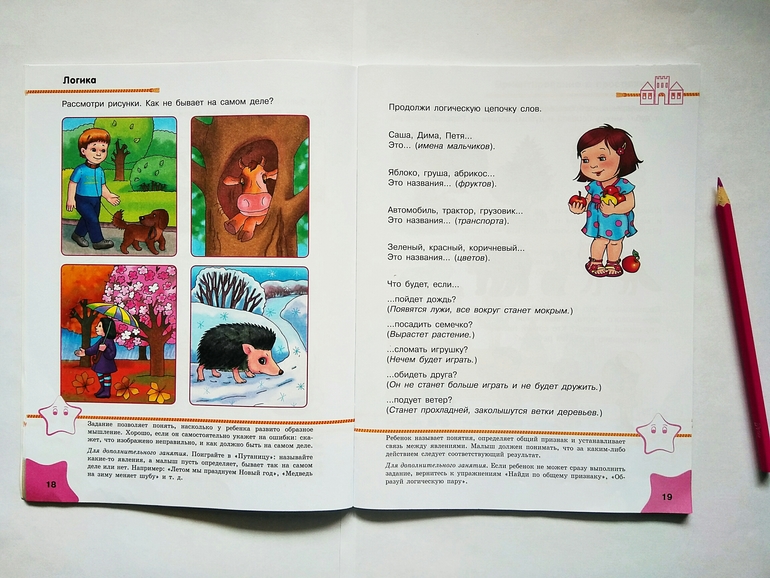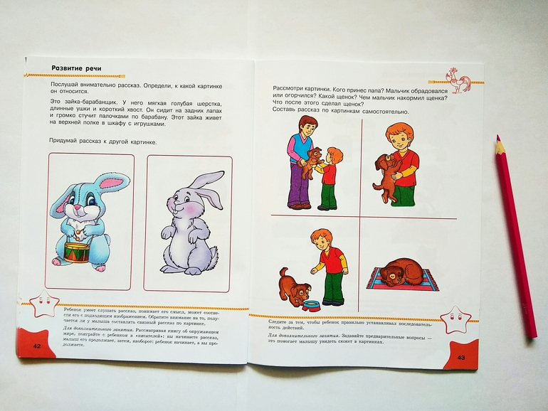 Очень понравилось, что внизу каждой(!) страницы есть рекомендации для родителей по выполнению данного упражнения, на что обратить внимание, что именно должен отвечать ребенок и что теоретически должен уметь/знать. Плюс идеи для дополнительной беседы по теме. Именно поэтому тетрадь не пролистывается быстро - авторы уже всё за вас продумали и подробно расписали что спросить, обсудить или во что поиграть.