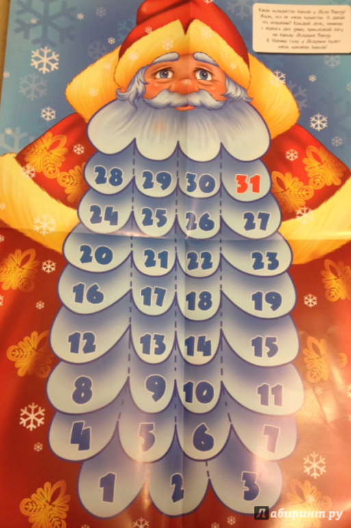 10 Не забываем купить Плакат Дед Мороз с календарем на декабрь в виде бороды дедушки. Эту бороду каждый день заклеиваем ватными шариками или дисками и ждем Новый Год! Большой формат (А2) , плотная бумага. Мы будем заклеивать бороду уже третий год! Купить ТУТ