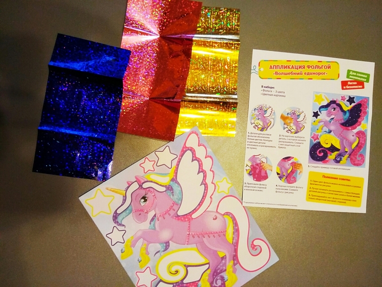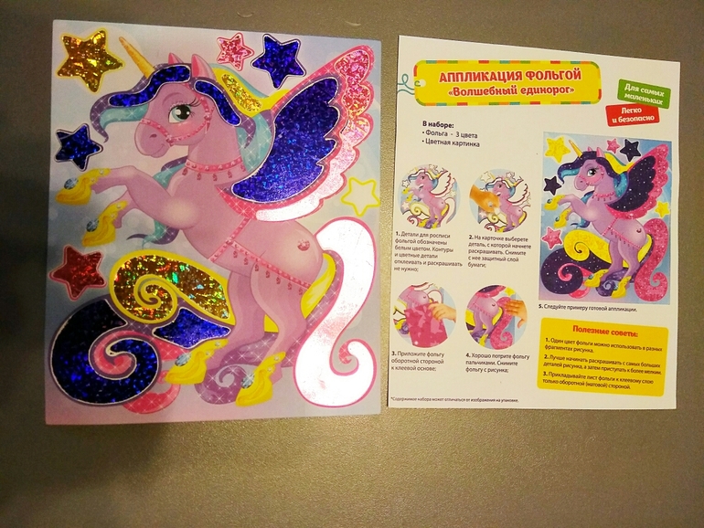 Есть несколько НО. Картинка небольшая. Фольги не много, и она в наборе согнутая. Элементов, которые нужно украсить - тоже не много: хвост, крылья, грива, звездочки и волны. Но как бы и цена 67 рублей без скидки - это очень хорошо для такого вида творчества.