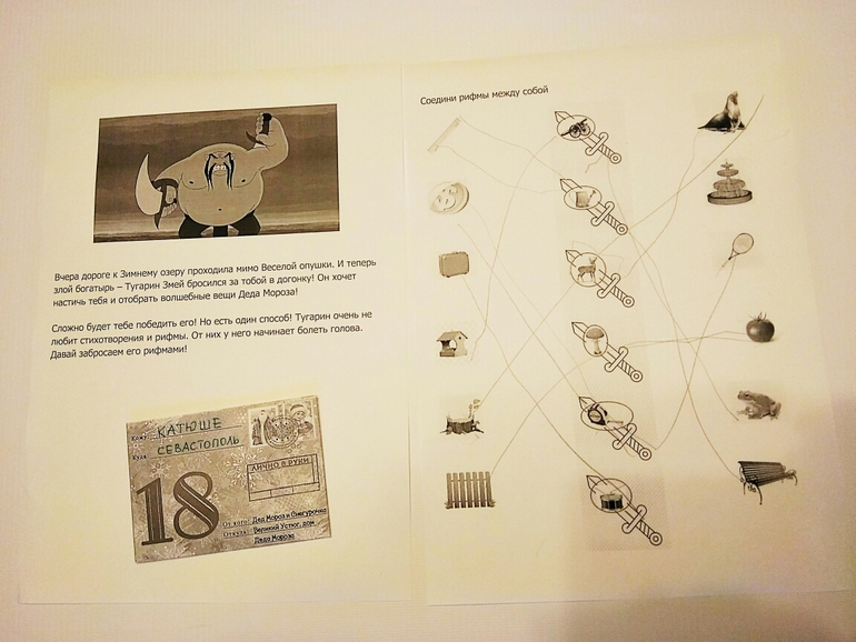 Когда мы пришли в Дремучий Лес, дорогу нам преградил злой воин Тугарин. Ох, и тяжело было победить его! Но Катюша справилась: с помощью рифм она быстро заморочила Тугарину голову и он сбежал с позором с поля боя .