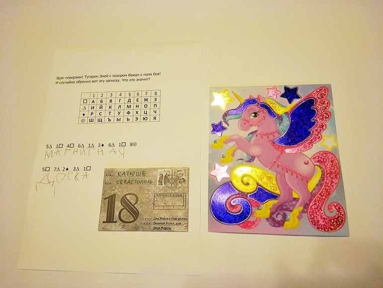 В его логове мы нашли странную записку, а разгадав её - нашли ещё одну цифру от Волшебных часов. И подарок - картинку для украшения фольгой "Единорог".