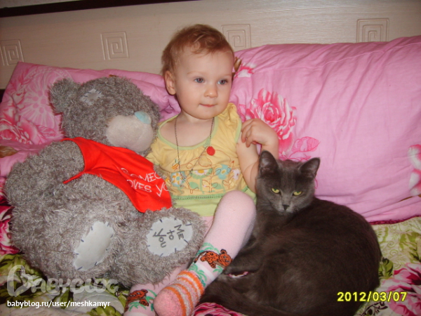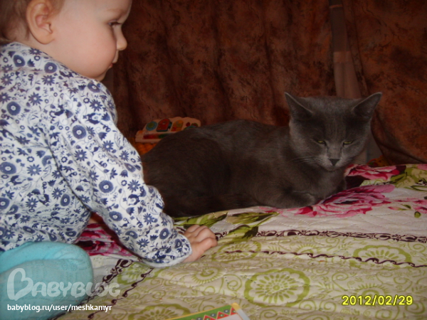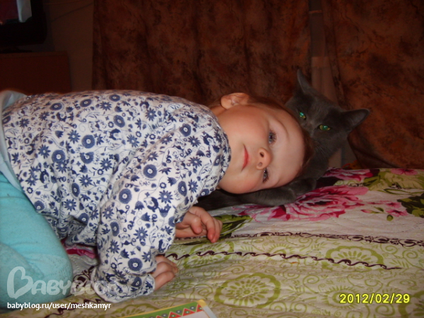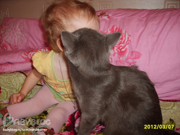 очень любит кису, насыпает ей сама поесть, иной раз всю пачку и мимо миски)))) Тоже ее обнимает, целует, садится сверху как на лошадь, киса терпит))))
