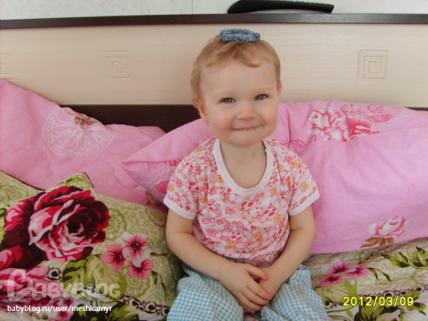 Укладываемся спать быстро, я ее беру на руки, даю бутылочку, она сначала попьет, потом у меня начинает спрашивать кто спит, это у нас такой ритуал на ночь, она говорит "мяу", я говорю, мяу спит, доча спрашивает "гав,гав" я говорю и гав гав спит, так про всех животных которых вспомнит, еще и бабушку, дедушку, маму, папу не забудет, потом, удостоверившись, что все спят засыпает сама со спокойной душой. Все это у на сминут 15 занимает. спит с вечера в кроватке, ночью раньше к себе брала, но с ней спать не удобно вся затекаю, сейчас стараюсь ночью в кроватку ложить, хоть коза и сопротивляется))) надеюсь переучу, просыпается раза два за ночь, когда уже придут спокойные ночи?????????