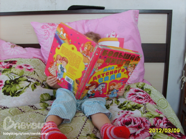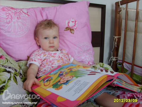 Сама читает книжки, мне показывает картинки, требует, чтоб я назвала, что это. Так смешно развалится на подушке как взрослая, наверное, нас копирует.